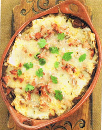 - 3. Spread 1/2 c bean mixture over bottom of a 13 x 9 inch baking dish. Stack tortillas on plate and microwave, covered, until pliable, about 1 minute. Dip tortillas one at a time in bean mixture in bowl, fold into quarters, and place in prepared dish, overlapping slightly. Pour remaining bean mixture over tortillas and top with chorizo and cheese. Cover with foil and bake until cheese is melted and tortillas are heated, about 12 minutes. Serve.