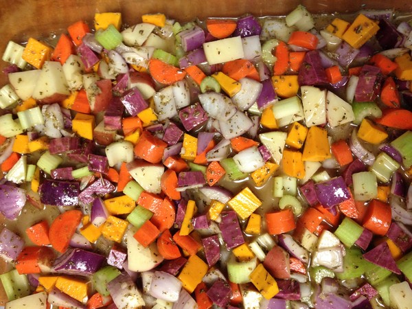 - 2. Combine the carrots, parsnips, cauliflower, onion and garlic in a roasting pan.